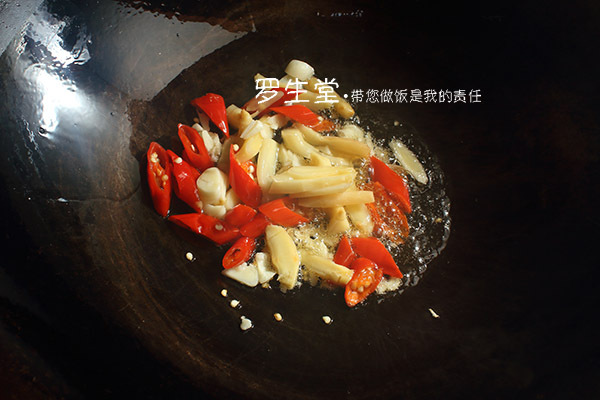 炒鍋洗凈,燒熱,下適量油,油溫在五六成左右,下泡椒、泡姜和蒜片大火煸炒一分鐘出香氣