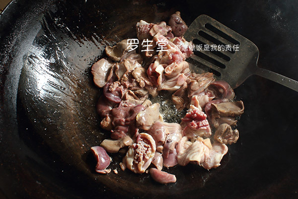 炒鍋燒熱,倒適量油,雞雜用黃酒抓勻,再放少許淀粉抓勻下鍋,大火炒至八九成熟盛出