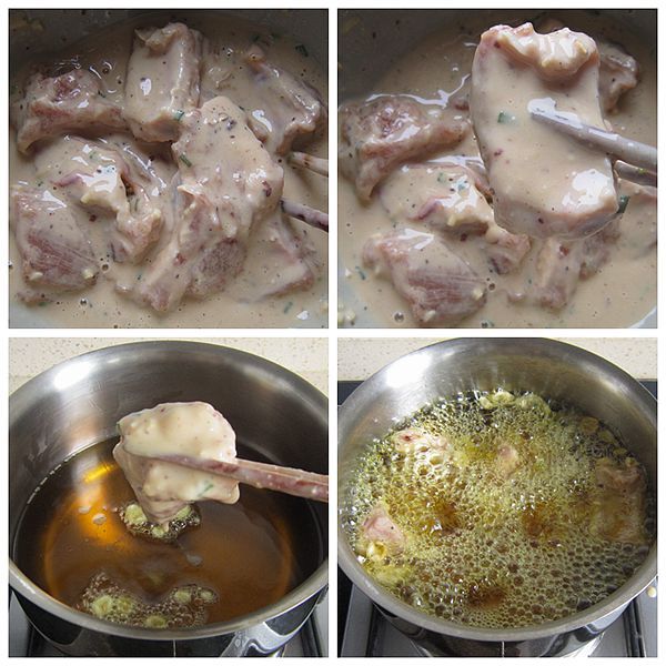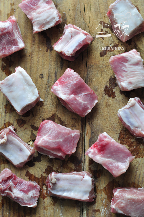 7、油鍋燒熱到6-7分熱,下入排骨塊。