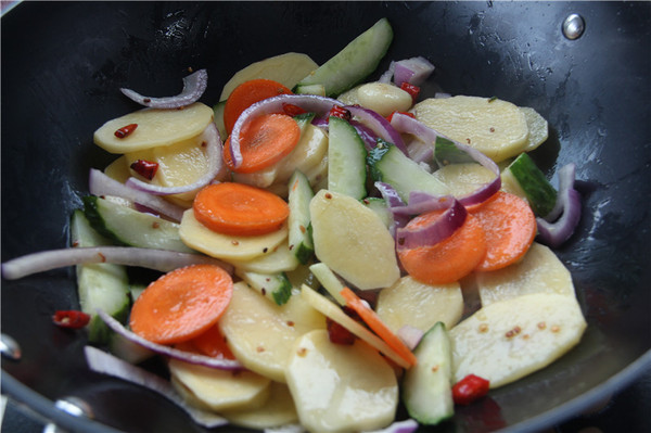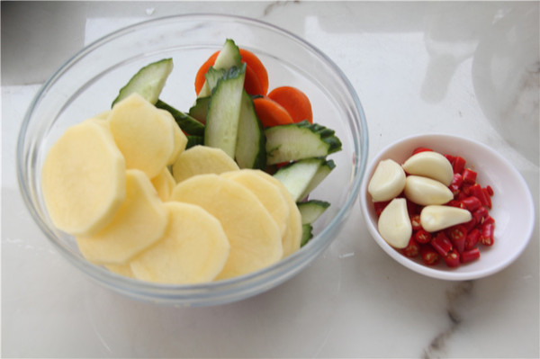 鯽魚(yú)1條、洋蔥半個(gè)、青瓜半根、胡蘿卜半截、土豆2個(gè)