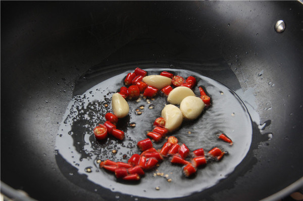 4、熱油鍋,放入辣椒跟蒜頭爆香