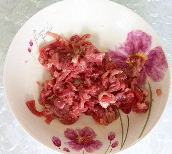 肉絲加蘋(píng)果醋(我用的是自己做的蘋(píng)果醋)、淀粉(小半勺)攪拌均勻浸味10分鐘。經(jīng)過(guò)這樣處理的肉絲炒出來(lái)又嫩又滑爽還特別香。