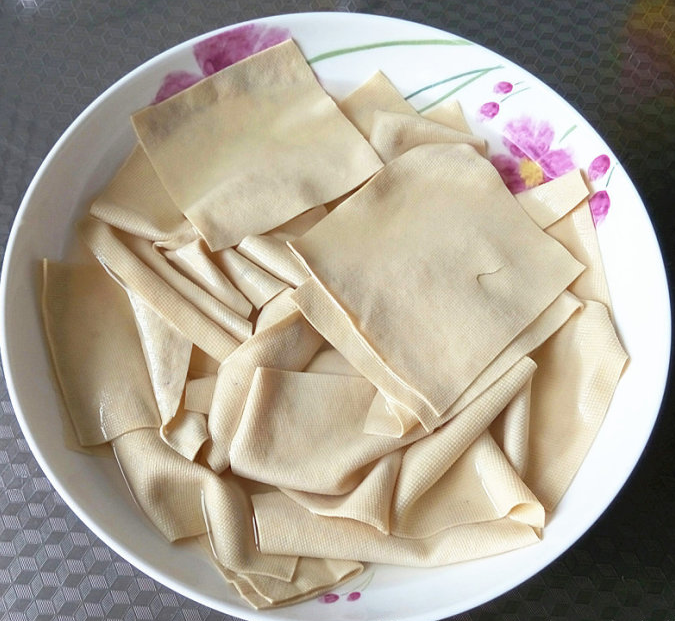 豆腐皮切正方形狀,開(kāi)水燙洗2、3遍。