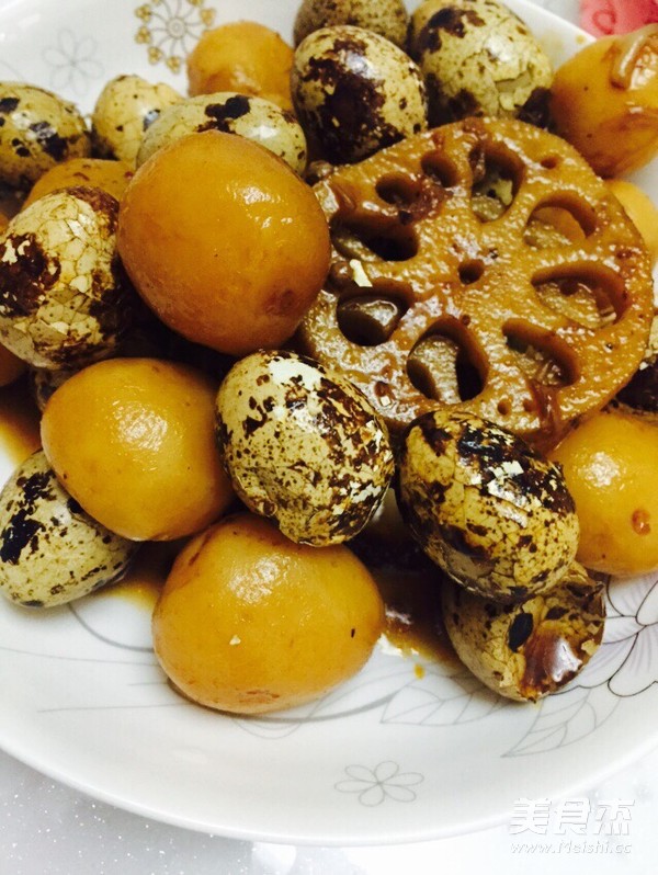 3.藕切片,小土豆洗凈,鵪鶉蛋冷水下鍋煮熟。然后依次將鵪鶉蛋敲破(我是先敲一個印子,然后把蛋滾一圈,就比較容易入味了?。?/p>