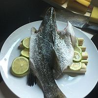 4. 魚(yú)處理好洗干凈以后中間剖開(kāi),內(nèi)外摸點(diǎn)鹽,然后像這樣放在檸檬和香茅上。這樣比較好熟,蒸的時(shí)間短些。當(dāng)然你不喜歡也沒(méi)關(guān)系,按照自己喜好來(lái)就好。如果你的魚(yú)比較大,肉比較厚可以在肉厚的地方劃幾刀
