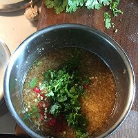 8. 把蒜茸辣椒圈放一起,加入青檸汁,魚(yú)露和糖漿調(diào)成汁,魚(yú)好了再把香菜切碎放入。