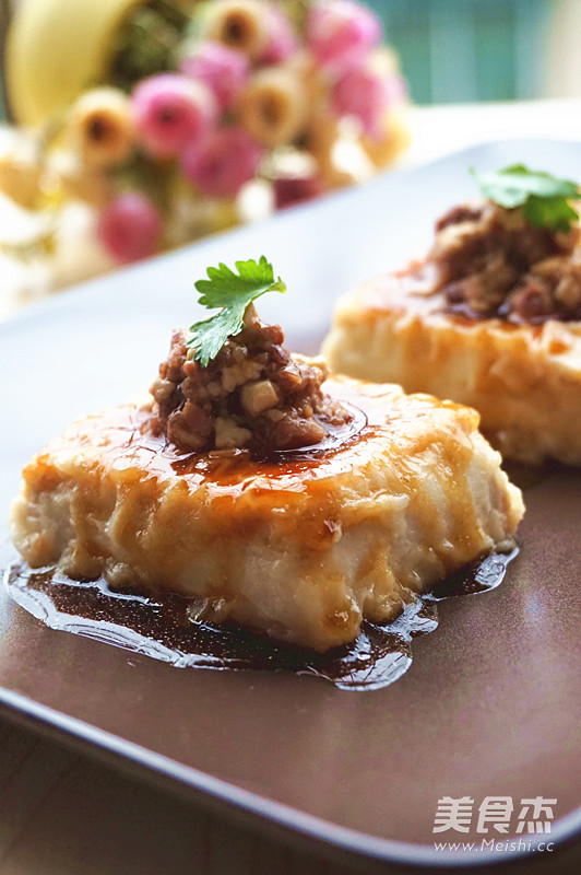 4.豬肉剁成肉末,然后用生抽、料酒、食鹽、挖出來(lái)的豆腐一起攪拌均勻