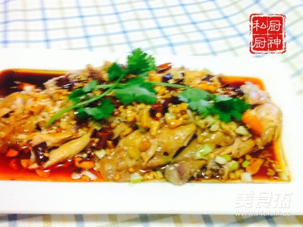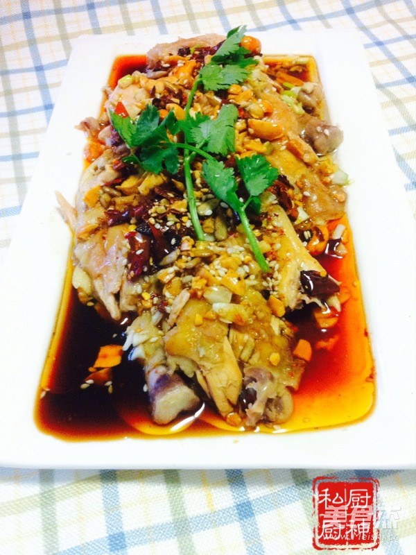 8.雞腿剁塊撒上油辣子花生芝麻,澆上調好醬汁,鍋內放適量油燒熱潑在雞腿上即可。