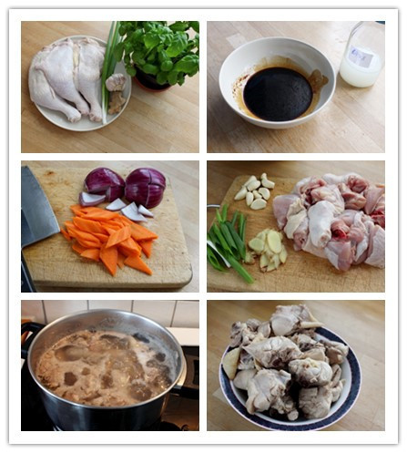 材料:雞腿3只(約)、小蔥2根、姜1塊(約20克)、蒜頭1個、九層塔盆栽1盆(約使用20克葉子)、紅皮洋蔥1個(約200克)、胡蘿卜1個(約100克)