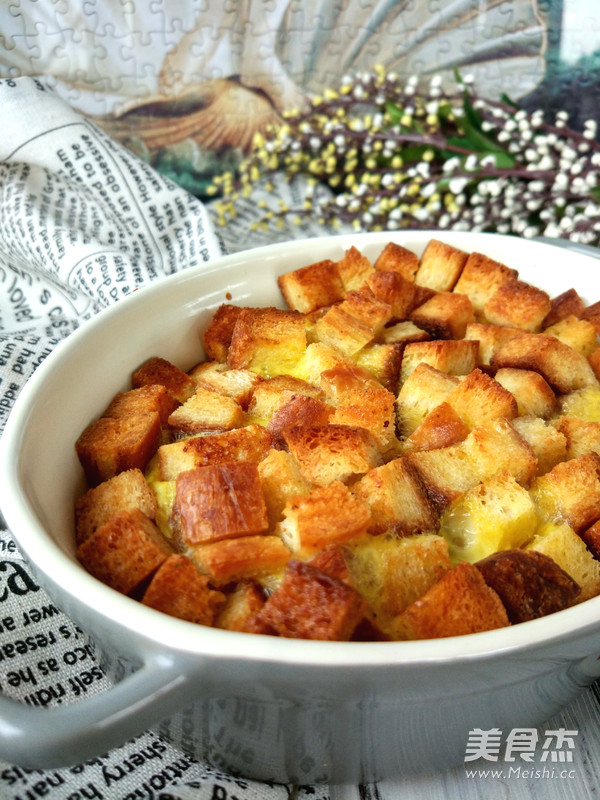 4.將吐司丁倒入翻炒至香酥,盛出備用