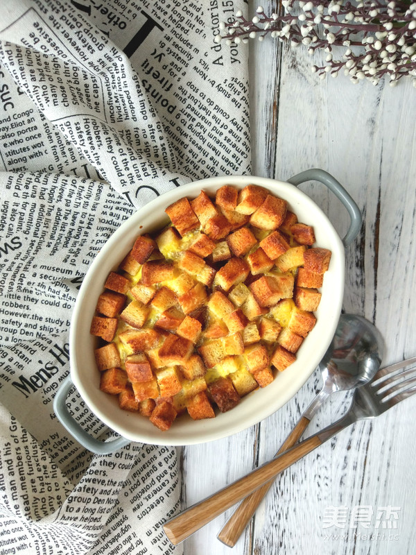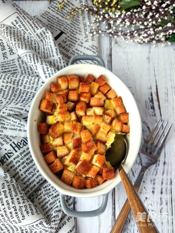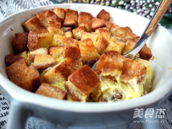 7.加入吐司丁,稍拌一下,繼續(xù)入烤箱中層,180度烤3-5分鐘左右,至蛋液凝固即可