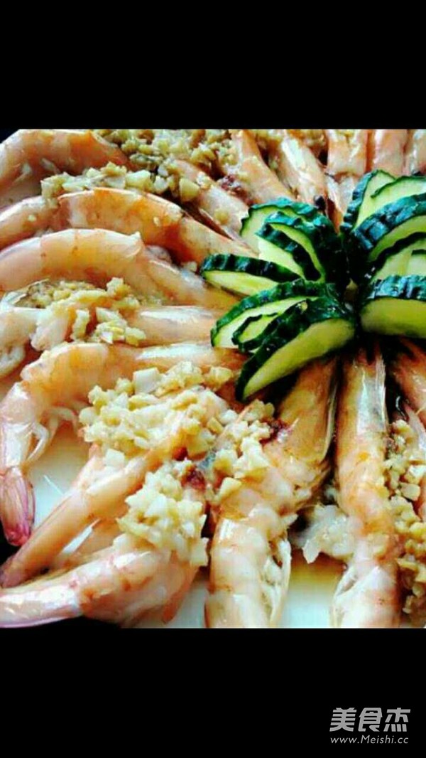 11.不啰嗦,把蒜末放入剛剛壓好的蝦背上,沒擺好造型,蒜蓉也隨意放,開始蒸