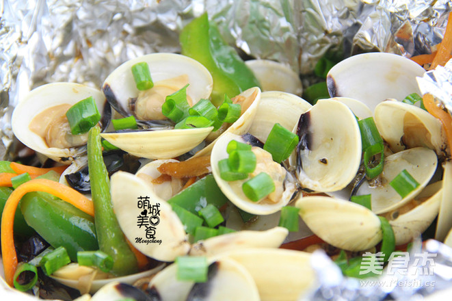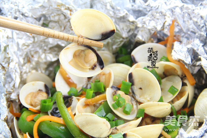 5.取一個(gè)不銹鋼碗,鋪上一層錫紙,底部放些腌料,再倒上白貝,面上再鋪上剩下的腌料,最后裹上錫紙(汁也全部倒入哦)