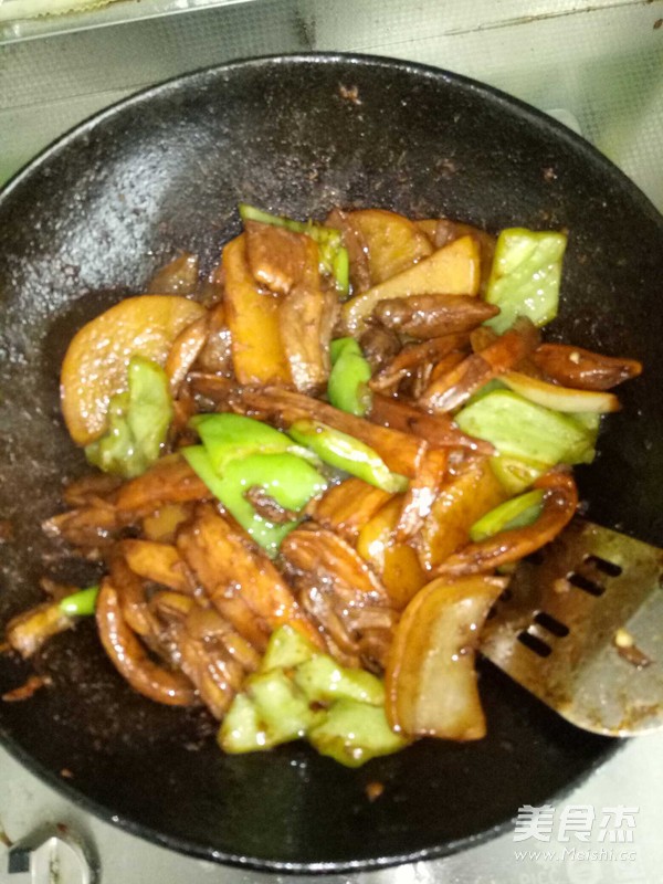3.鍋里的油放入姜,八角,下入洋蔥炒香后放入過好油的食材,加入生抽老抽耗油,翻炒至土豆成熟后放入辣椒,繼續(xù)翻炒,因為我用的鑄鐵鍋比較厚,所以辣椒稍微一軟就關火出鍋