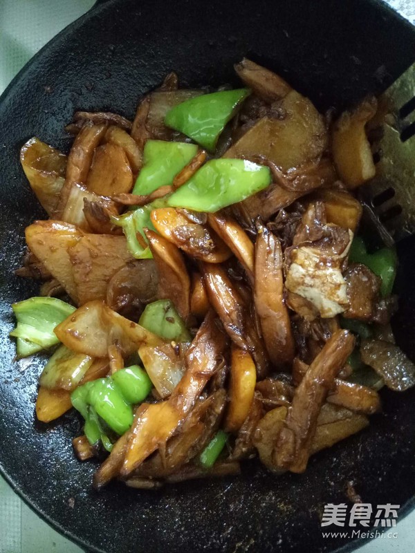 2.五花肉下鍋炒出油盛出,再加入適量的花生油把土豆過一下油,便于成熟,另起一鍋干鍋放入杏鮑菇干煸出水汽后,再過下油!備用