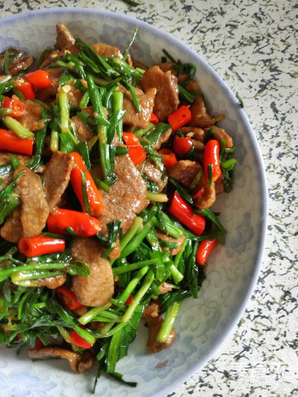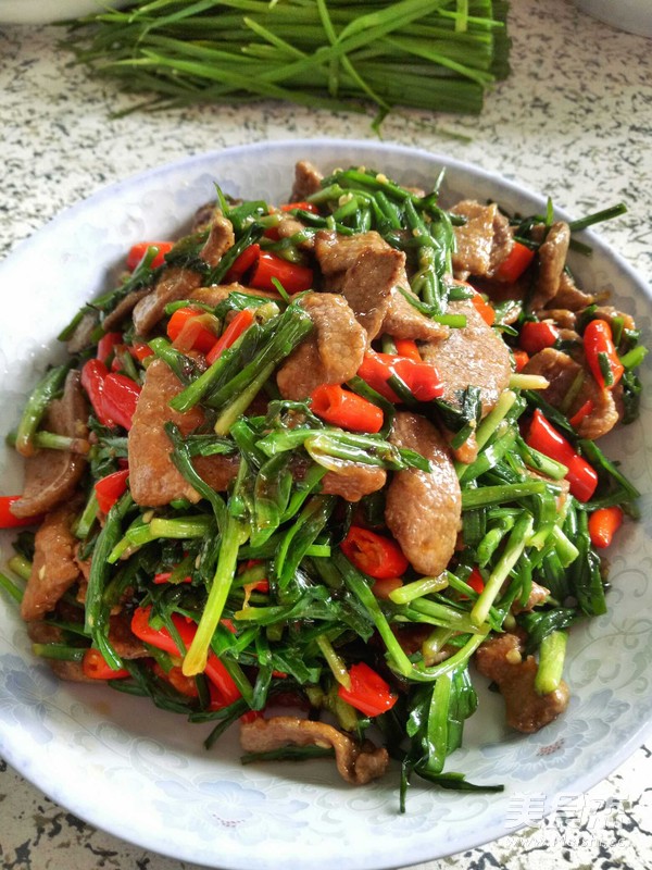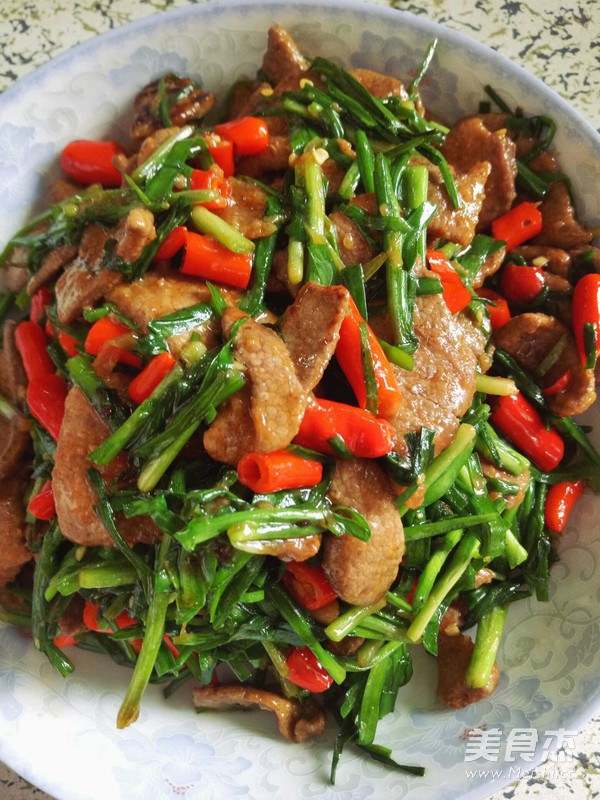 9.下入韭菜一起翻炒,加配料調(diào)味。