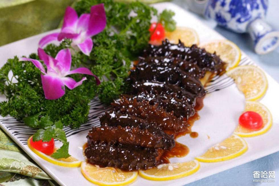 紅燒梅花參的主料為水發(fā)梅花參,主要配料有油菜和百靈菇等。把泡發(fā)后的梅花參從中間切成兩半,用開水燙透,然后將水控凈。經(jīng)大廚烹飪,色澤紅亮,再配上新鮮的百靈菇,味道嫩滑鮮甜。裝盤時,在盤中擺入一圈已經(jīng)烹好的油菜。翠綠的油菜配上紅亮的梅花參,一盤嬌艷欲滴的紅燒梅花參就呈現(xiàn)在你的面前了。嘗一口,味道醇厚、鮮美,具有滋陰補腎,增強機體免疫力之功效。據(jù)介紹,梅花參又稱“鳳梨參”、“?;▍ⅰ钡?,是三亞三絕之一,主要產(chǎn)自南海諸島海域,因其鮮活的時候,橙色的背部生滿了梅花瓣狀的肉刺而得名。