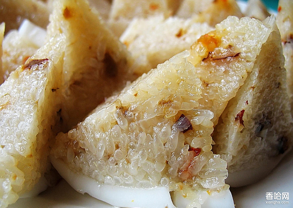 用料:大米250克、椰子2個、蝦仁100克、叉燒100克、火腿10克、干蝦米25克、濕冬菇25克、精鹽6克、雞油150克、蒜茸25克、清水適量。