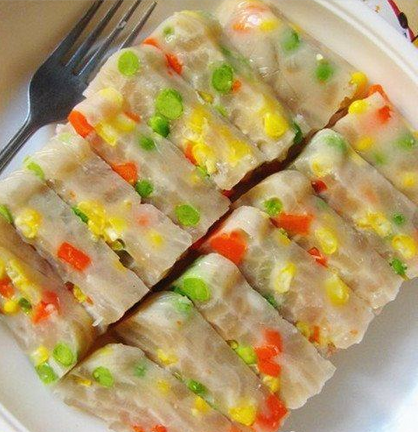 食材主料:豬皮500g、青豆50g、玉米粒50g、胡蘿卜粒50g、濃縮寶適量、味精適量、鹽適量