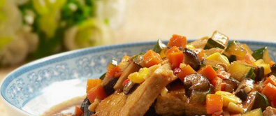 食材主料:老豆腐200g、胡蘿卜50g、黃瓜50g、香菇50g、玉米粒50g、蒜子適量、姜適量、朝天椒適量、醬油適量、料酒適量、精適量、白糖適量、胡椒粉適量、水淀粉適量