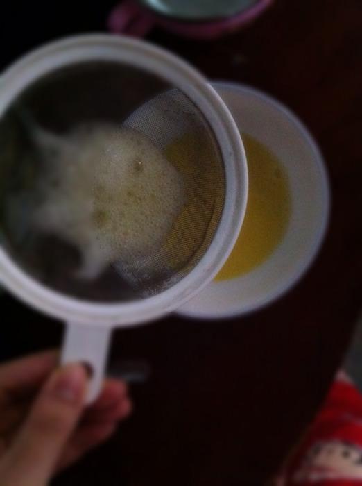 3.把湯涼溫緩緩的倒入蛋黃中
