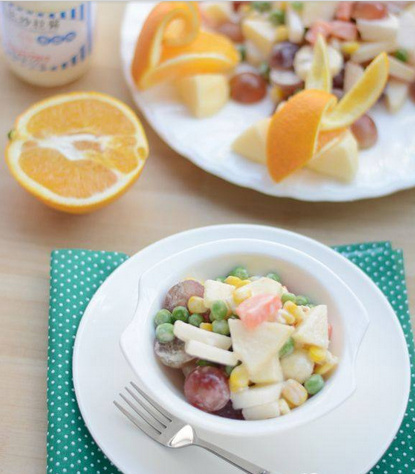 食材主料:胡蘿卜1小根、豌豆80g、玉米80g、提子1小串、梨子1個、香蕉2根、蘋果2個、橙子2個、丘比沙拉醬2湯勺
