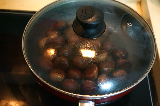3. 放在平底鍋中,先敞開蓋,用大火將栗子表面的水汽蒸發(fā);