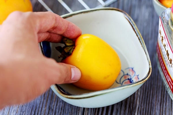 2、小碗里倒進白酒,把柿子滾動幾下蘸上白酒。