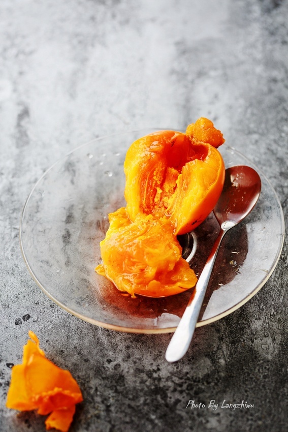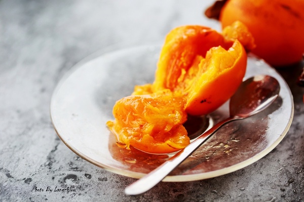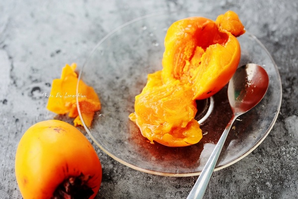 俗話說“老太太吃柿子,專揀軟的捏”。柿子漤到一定程度果肉變成濃稠的果汁,吃的時候只需把柿子皮挑開一個口,用嘴嘬著吃。剛摘下的柿子又硬又澀是不能直接吃的,老家的做法是“漤”,即把柿子用酒或熱水來脫澀,漤好的柿子,軟軟的,甜甜的。果肉晶瑩剔透,色澤金黃,吸一口甜過蜜糖。