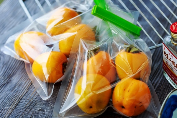 4、依次把所有柿子蘸上白酒,把蘸上白酒的柿子裝進密封袋或干凈容器里密封。放在溫暖處,幾天后柿子即可食用。用白酒漤過的柿子,果肉綿軟口感香甜,帶有淡淡的酒香。