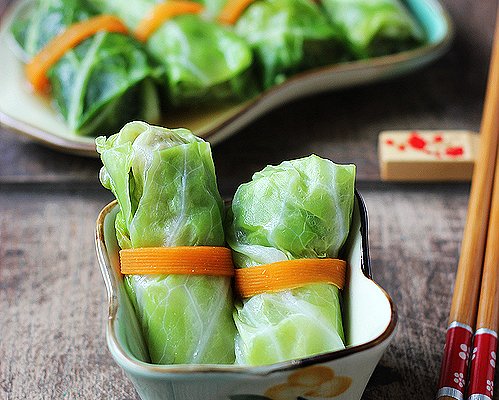7)鍋中水燒開,水中加1小勺鹽和幾滴油,將卷心菜放入水中汆燙至軟