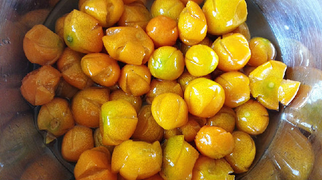 15、將腌好的金錢桔連糖水一起倒入大口徑的鍋中,用中火進(jìn)行熬煮。