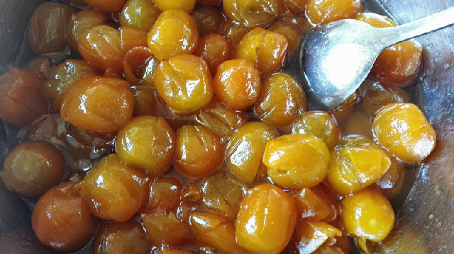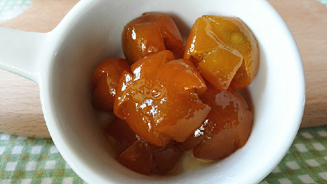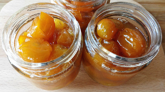 16、將金錢桔中的水分慢慢蒸發(fā)掉,讓湯汁慢慢變濃稠,發(fā)現(xiàn)湯汁越來越少且勺子攪拌不暢的時(shí)候就表明熬好了。