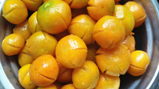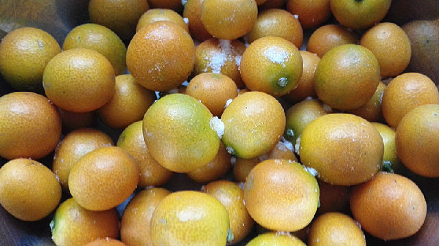 4、用手將食鹽和金錢桔在手中反復(fù)搓揉,讓食鹽將金錢桔表面的蠟質(zhì)搓掉后再用清水將金錢桔再次沖洗,清洗的時(shí)候可以將金錢桔上的綠色小蒂去掉不要。
