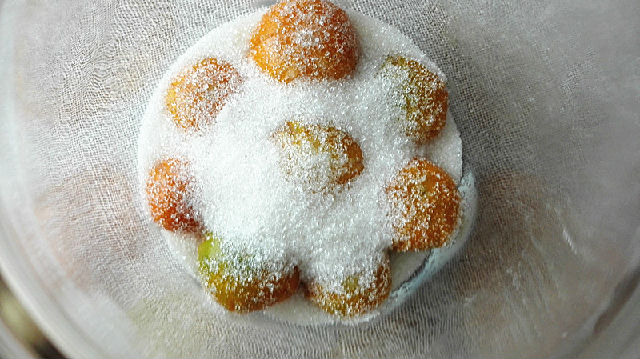 13、繼續(xù)碼第二層金錢桔,就這樣一層金錢桔一層細(xì)砂糖交錯進(jìn)行。