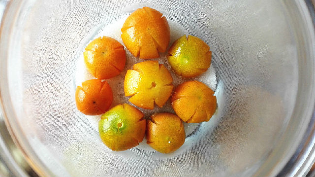 3、將金錢桔瀝干水分后撒入適量的食鹽。