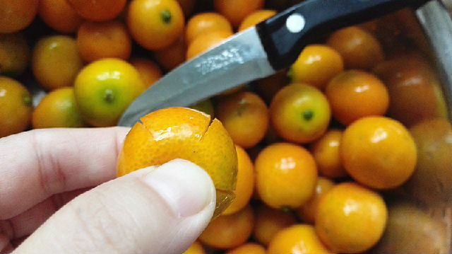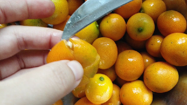 5、取一顆金錢桔,用水果刀在桔子身上縱向劃刀。