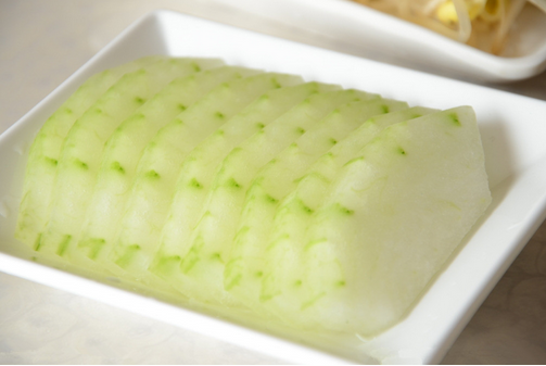 1.冬瓜去皮切成馬蹄形,在沸水中稍煮,撈出浸冷瀝干;