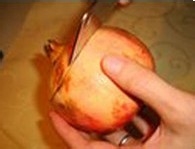 拿出一個石榴用水洗凈,在石榴的落花處往下7厘米處,橫切開。如圖片中形狀。