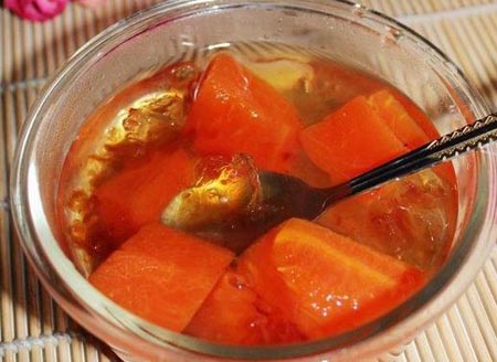 4、木瓜對半切開,去籽,將隔水蒸過的桃膠倒入木瓜中,撒上少許冰糖,再繼續(xù)蒸20分鐘左右即可。