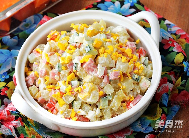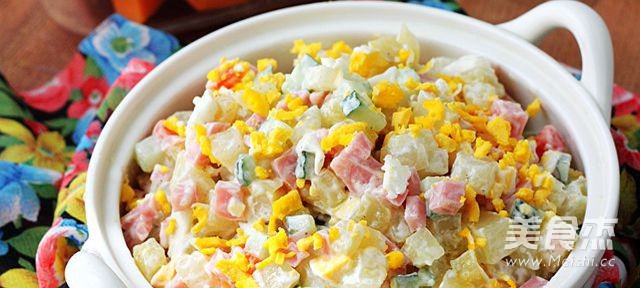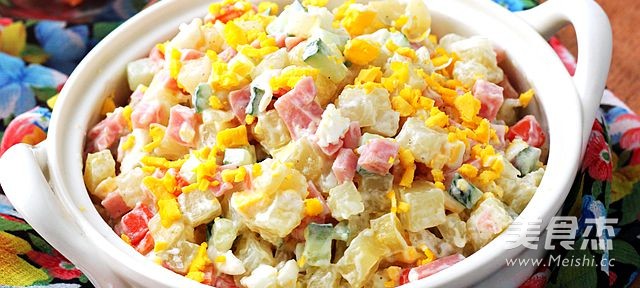 7.將晾涼的土豆胡蘿卜放入干凈的盆中,放入切成細(xì)末的圓蔥和切成碎丁的火腿腸黃瓜,還有蛋清碎和一部分蛋黃碎,放入所有的調(diào)料拌勻后裝盤。上面再撒上剩下的蛋黃碎裝飾即可