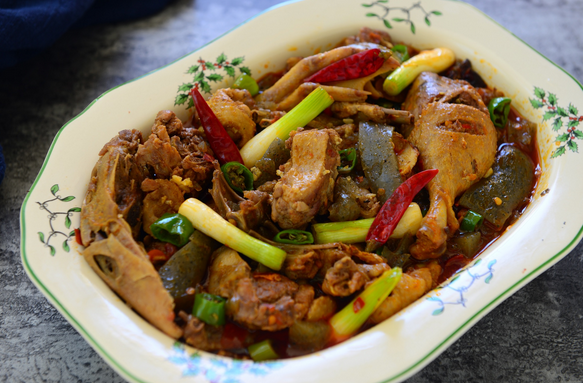5.下入鴨塊、姜末、蒜末、精鹽、料酒和醬油小火燒至鴨熟。