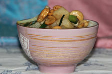 2、炒至沙葛顏色變深時(shí),倒入腰果繼續(xù)翻炒。