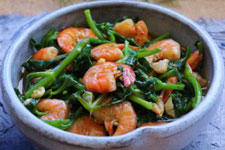 主料:海蝦100g,穿心蓮400g。調(diào)料:食鹽醬油10ml,雞精3g,蒜,調(diào)和油,花椒粉3g。