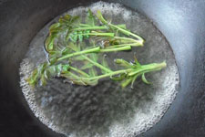 2、將香椿擇好洗干凈之后,放入開水鍋中焯燙一下,然后撈出控水。