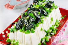 主料:內(nèi)酯豆腐1盒,松花蛋1個,小蔥1把。調(diào)料:食鹽1茶匙,雞精1/3茶匙,香油1茶匙。
