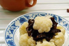主料:菜花1個輔料:干木耳3朵,蒜末若干,鹽1小勺,醋1小勺,味精1/2小勺,香油3滴。