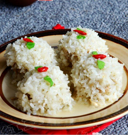 食材主料:豬腿肉200g、糯米150g、雞蛋1個、蔥姜適量、鹽適量、白糖2g、料酒15ml、肉清湯200ml、水淀粉適量、雞精適量