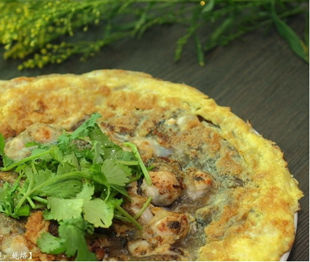 15、將蠔烙的底面也煎至金黃,取出裝盤,撒上芫荽開吃,喜歡重口味的朋友可以蘸著魚露食用。