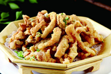 5、里脊下鍋炸至外表凝固,然后油溫升至7成,復(fù)炸至金黃色;